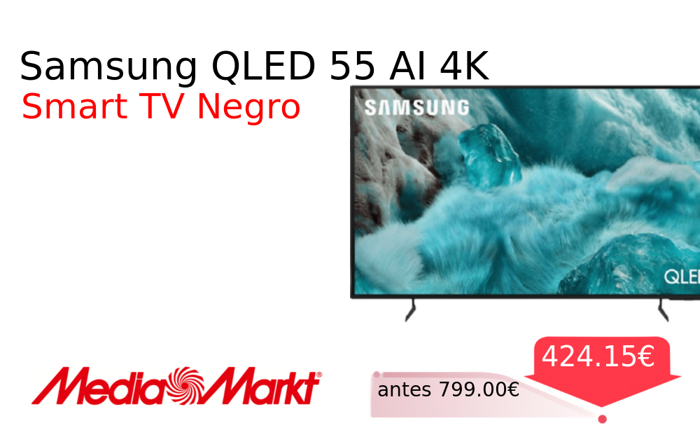 40% 📉 Vaya descuentazo‼‼ Samsung QLED 55 AI 4K❗️🆕 #MediaMarkt 📛Precio Ya 424.15€❗️ (PVP: +799.00€) ✨Televisor QLED 55 pulgadas con procesador AI 4K para imágenes nítidas y sonido envolvente Producto reacondicionado con garantía completa con tecnologia de imagen avanzada. cholloya.com/TV_QLED_55_SAMS