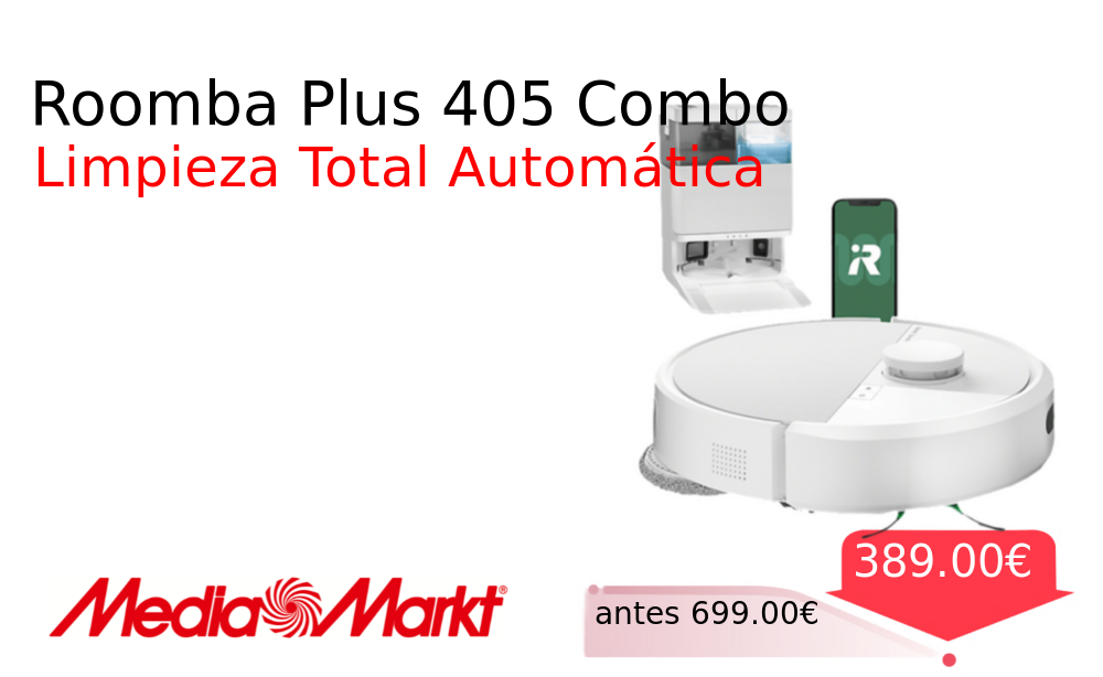 40% 📉 Vaya descuentazo‼‼ Roomba Plus 405 Combo❗️🆕 #MediaMarkt 📛Precio Ya 389.00€❗️ (PVP: +699.00€) ✨Robot friegasuelos con base autolavable que ofrece succión potente y mopas giratorias DualClean para limpieza avanzada de suelos sin esfuerzo. cholloya.com/ROOMBA_405_COMB