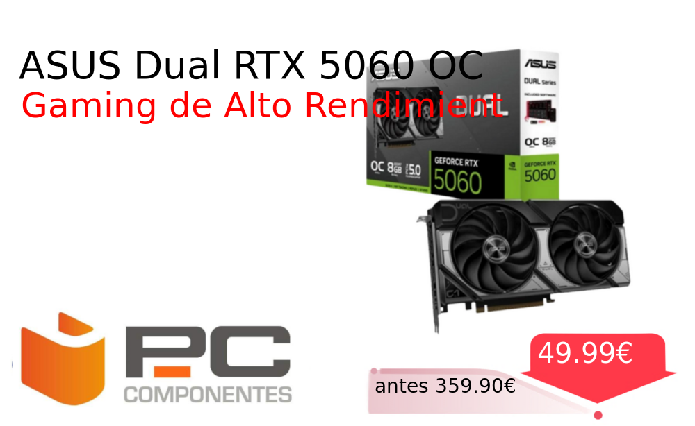 Mitad de precio✂️ ASUS Dual RTX 5060 OC❗️🆕 #PcComponentes 📛Precio Ya 49.99€❗️ (PVP: +359.90€) ✨Tarjeta gráfica ASUS con tecnología RTX y DLSS4 avanzada Rendimiento excepcional para gaming y diseño con memoria GDDR7 ultrarrápida y refrigeración optimizada. cholloya.com/ASUS_RTX5060_OC