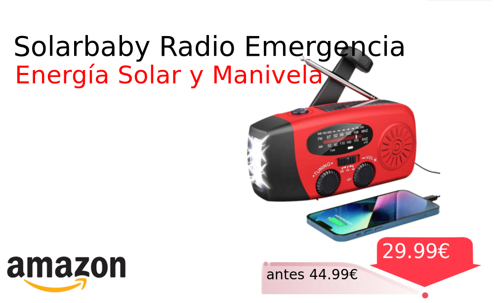 Más de un 30% 🚀 Solarbaby Radio Emergencia❗️🆕 #Amazon 🇪🇸 📛Precio Ya 29.99€❗️ (PVP: +44.99€) ✨Radio solar de emergencia con manivela linterna LED y sintonizador AM FM meteorológico Incluye batería recargable para cargar dispositivos móviles en situaciones críticas. cholloya.com/RADIO_SOLAR_EME