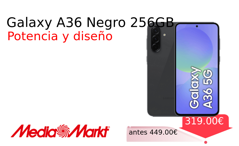 Buen Precio✨ Galaxy A36 Negro 256GB❗️🆕 #MediaMarkt 📛Precio Ya 319.00€❗️ (PVP: +449.00€) ✨Smartphone con pantalla Super AMOLED de 6 7 pulgadas procesador Snapdragon y batería de larga duración Rendimiento fluido y conectividad 5G integrada para uso. cholloya.com/SAMSUNG_A36_5G