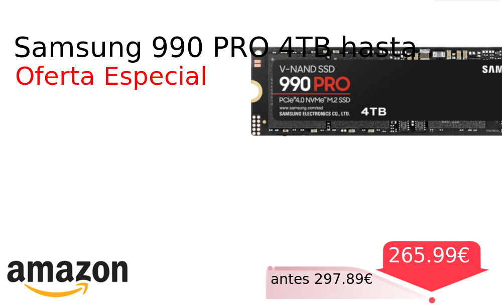 Buen Precio✨ Samsung 990 PRO 4TB hasta❗️🆕 #Amazon 🇪🇸 📛Precio Ya 265.99€❗️ (PVP: +297.89€) ✨Producto de calidad superior con caracteristicas premium diseno cuidado y excelente relacion calidad precio para satisfaccion garantizada con diseno innovador y funcional. cholloya.com/SAMSUNG_990