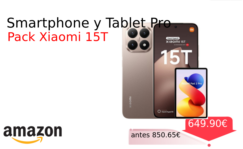 Buen Precio✨ Smartphone y Tablet Pro❗️🆕 #Amazon 🇪🇸 📛Precio Ya 649.90€❗️ (PVP: +850.65€) ✨Smartphone de 12 256GB con lentes Leica Summilux y pantalla Eye Care de 120 Hz Incluye tablet Pro con HyperCharge Calidad premium. cholloya.com/XIAOMI_15T_PACK