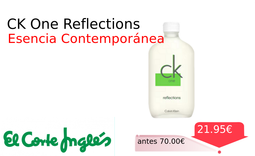 Mitad de precio✂️ CK One Reflections❗️🆕 #Elcorteingles 📛Precio Ya 21.95€❗️ (PVP: +70.00€) ✨Fragancia icónica con notas cítricas y amaderadas que proyecta frescura y modernidad Ideal para uso diario con un aroma vibrante y duradero. cholloya.com/CKONE_REFLECTIO