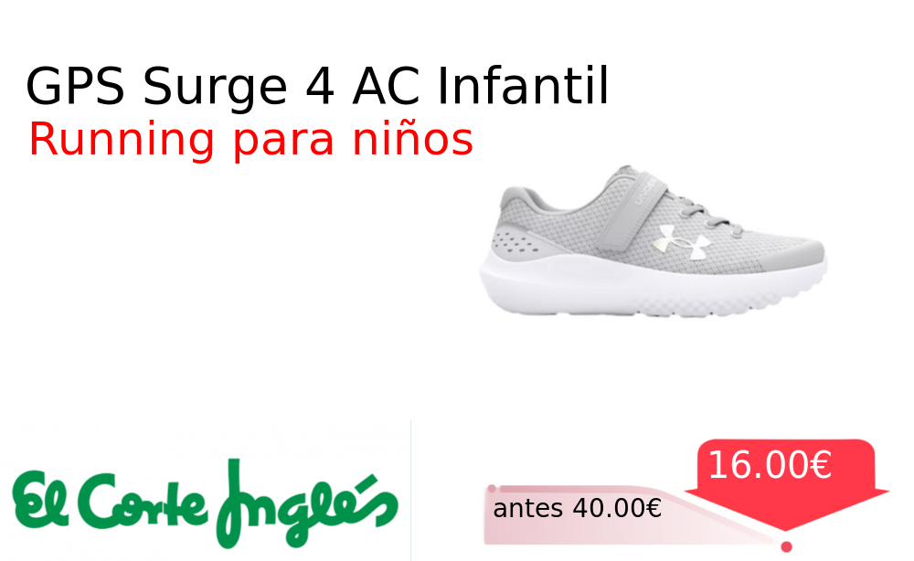 Mitad de precio✂️ GPS Surge 4 AC Infantil❗️🆕 #Elcorteingles 📛Precio Ya 16.00€❗️ (PVP: +40.00€) ✨Zapatillas de running infantiles Under Armour con tecnología GPS Surge 4 AC Diseñadas para ofrecer comodidad y rendimiento en cada entrenamiento ideales para jóvenes. cholloya.com/UA_GPS_SURGE_4_
