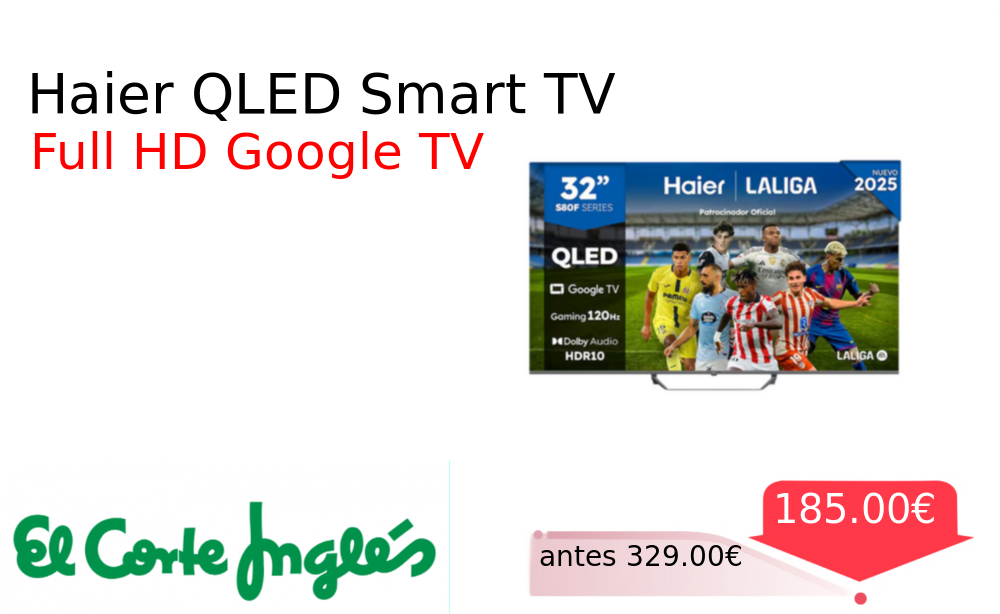 40% 📉 Vaya descuentazo‼‼ Haier QLED Smart TV❗️🆕 #Elcorteingles 📛Precio Ya 185.00€❗️ (PVP: +329.00€) ✨Televisor QLED de 80 centímetros con resolución Full HD Sistema Smart Google TV integrado y tecnología HDR10 para colores vibrantes Diseño elegante y experiencia. cholloya.com/HAIER_S80E