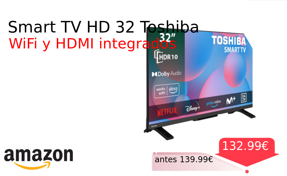 Buen Precio✨ Smart TV HD 32 Toshiba❗️🆕 #Amazon 🇪🇸 📛Precio Ya 132.99€❗️ (PVP: +139.99€) ✨Televisor LED de 32 pulgadas con resolución HD y tecnología Smart TV Conexión WiFi integrada y dos puertos HDMI para disfrutar de tu entretenimiento. cholloya.com/TOSHIBA_32WV256