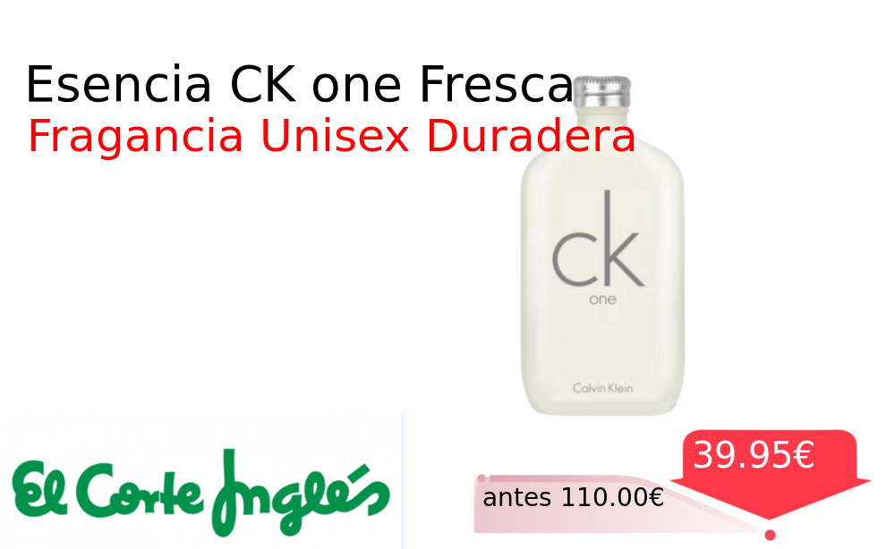 Mitad de precio✂️ Esencia CK one Fresca❗️🆕 #Elcorteingles 📛Precio Ya 39.95€❗️ (PVP: +110.00€) ✨Fragancia icónica de notas frescas y amaderadas Unisex y versátil para uso diario Botella transparente con diseño minimalista que perdura. cholloya.com/CK_ONE_200ML