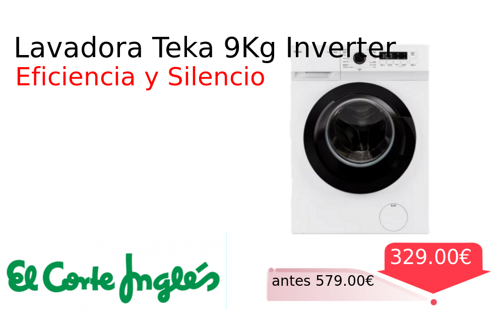 40% 📉 Vaya descuentazo‼‼ Lavadora Teka 9Kg Inverter❗️🆕 #Elcorteingles 📛Precio Ya 329.00€❗️ (PVP: +579.00€) ✨Lavadora Teka con capacidad para nueve kilos y revoluciones máximas de mil cuatrocientas Motor inverter silencioso y eficiente quince programas de lavado diferentes. cholloya.com/TEKA_WMK40940