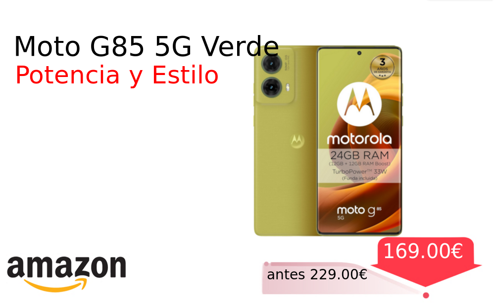 Buen Precio✨ Moto G85 5G Verde❗️🆕 #Amazon 🇪🇸 📛Precio Ya 169.00€❗️ (PVP: +229.00€) ✨Smartphone con pantalla infinita de 6 67 pulgadas y cámara Sony LYTIA 600 de 50MP con OIS Batería de larga duración y sonido envolvente. cholloya.com/MOTO_G85_5G