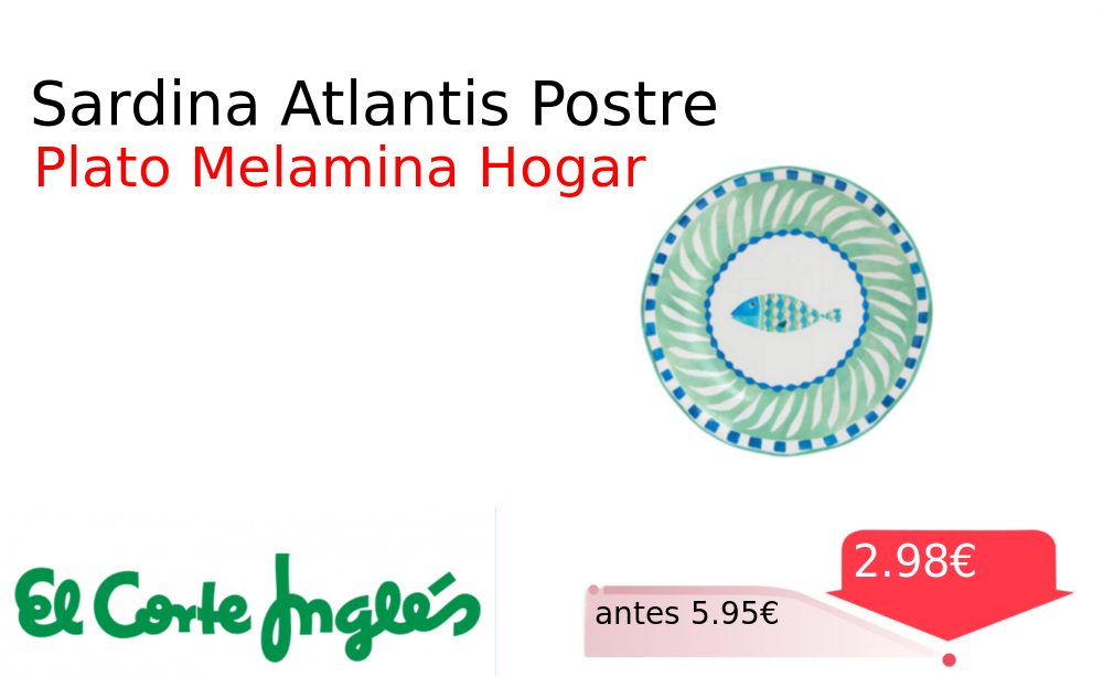 40% 📉 Vaya descuentazo‼‼ Sardina Atlantis Postre❗️🆕 #Elcorteingles 📛Precio Ya 2.98€❗️ (PVP: +5.95€) ✨Plato de postre con diseño de sardina Atlantis Material melamina resistente y duradero Ideal para uso diario en tu hogar. cholloya.com/ATLANTIS_SARDIN