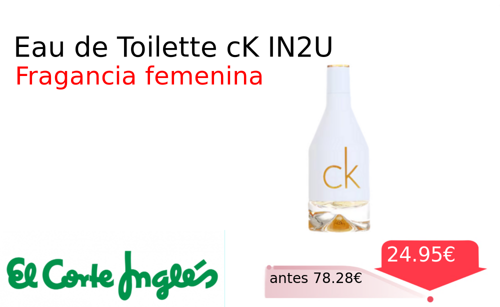 Mitad de precio✂️ Eau de Toilette cK IN2U❗️🆕 #Elcorteingles 📛Precio Ya 24.95€❗️ (PVP: +78.28€) ✨Fragancia femenina fresca y moderna con notas cítricas y florales Ideal para el día a día proyecta una esencia juvenil y vibrante que perdura. cholloya.com/CK_IN2U_WOMEN