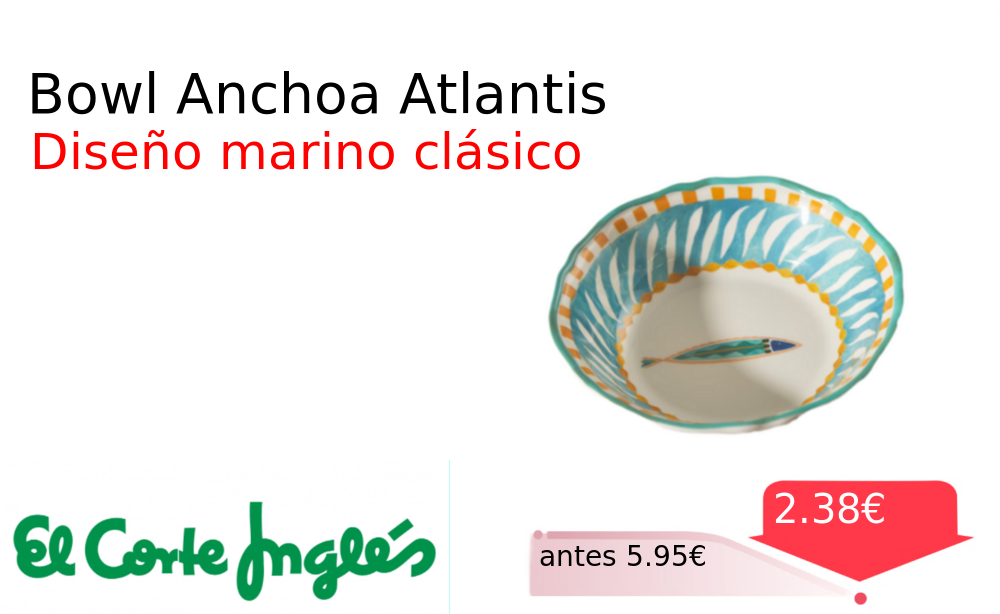 Mitad de precio✂️ Bowl Anchoa Atlantis❗️🆕 #Elcorteingles 📛Precio Ya 2.38€❗️ (PVP: +5.95€) ✨Un bowl de melamina con un diseño clásico de anchoas Perfecto para servir aperitivos o ensaladas Resistente y fácil de limpiar para tu día. cholloya.com/BOWL_ANCHOA_ATL