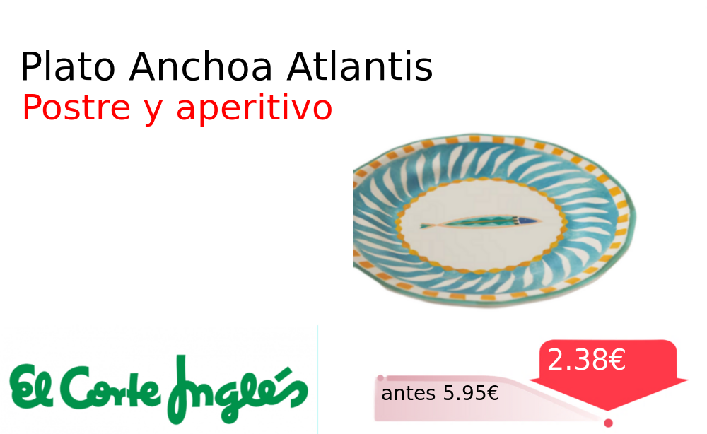 Mitad de precio✂️ Plato Anchoa Atlantis❗️🆕 #Elcorteingles 📛Precio Ya 2.38€❗️ (PVP: +5.95€) ✨Plato de melamina con diseño de anchoa ideal para servir postres o aperitivos Resistente y ligero perfecto para el uso diario en casa. cholloya.com/ATLANTIS_ANCHOA