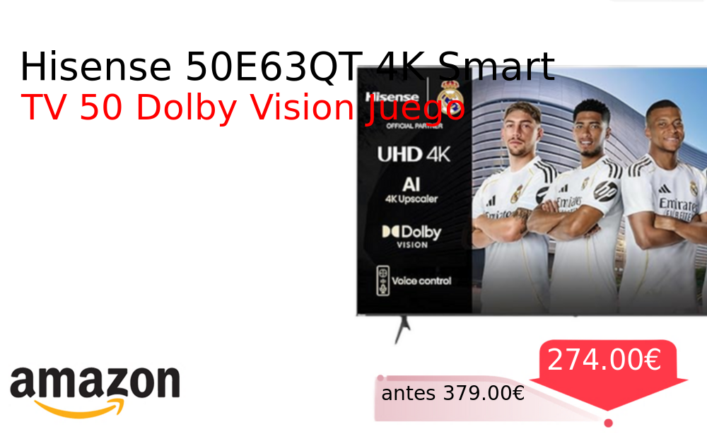 Buen Precio✨ Hisense 50E63QT 4K Smart❗️🆕 #Amazon 🇪🇸 📛Precio Ya 274.00€❗️ (PVP: +379.00€) ✨Televisor UHD 4K de 50 pulgadas con Dolby Vision y modo juego avanzado Smart TV con control por voz sonido envolvente DTS y funciones. cholloya.com/HISENSE_50E63QT