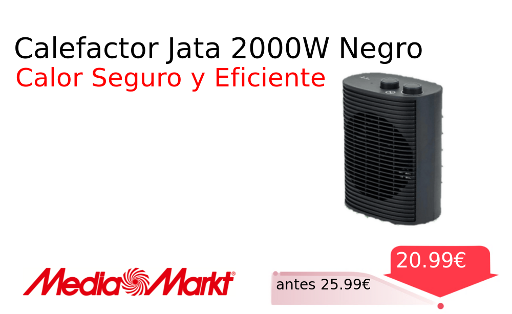 Buen Precio✨ Calefactor Jata 2000W Negro❗️🆕 #MediaMarkt 📛Precio Ya 20.99€❗️ (PVP: +25.99€) ✨Calefactor Jata de 2000W con dos niveles de calor y termostato Diseño negro con asa de transporte y sistema de seguridad antivuelco para un. cholloya.com/JATA_JCTV1193