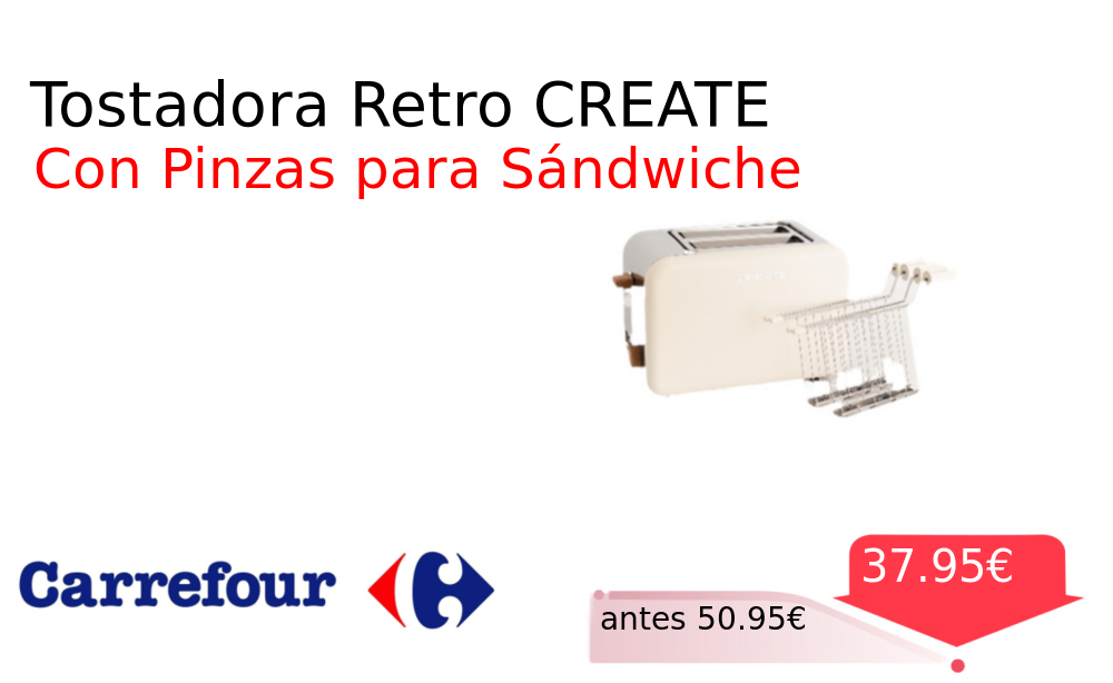 Buen Precio✨ Tostadora Retro CREATE❗️🆕 #Carrefour 📛Precio Ya 37.95€❗️ (PVP: +50.95€) ✨Tostadora retro para rebanadas anchas incluye dos pinzas para preparar sándwiches calientes con un diseño clásico y funcionalidad moderna con diseno innovador y funcional. cholloya.com/CREATE_TOSTADOR