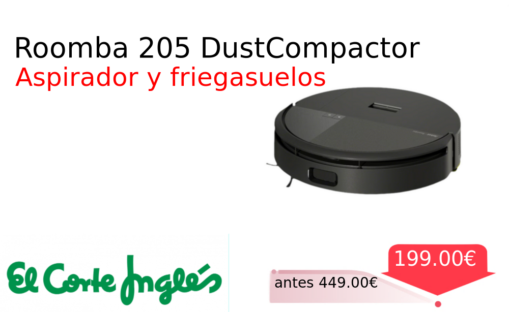 Mitad de precio✂️ Roomba 205 DustCompactor❗️🆕 #Elcorteingles 📛Precio Ya 199.00€❗️ (PVP: +449.00€) ✨Robot aspirador y friegasuelos con tecnología de compactación integrada Limpia y friega de forma autónoma manteniendo tu hogar impecable con un solo dispositivo inteligente. cholloya.com/ROOMBA_205_COMB