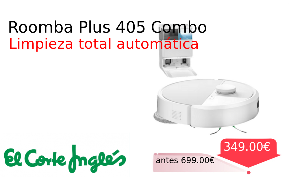 Mitad de precio✂️ Roomba Plus 405 Combo❗️🆕 #Elcorteingles 📛Precio Ya 349.00€❗️ (PVP: +699.00€) ✨Este robot aspirador friega y limpia tus suelos automáticamente Incluye una base que lava y seca las mopas por ti para una higiene continua. cholloya.com/ROOMBA_405_COMB