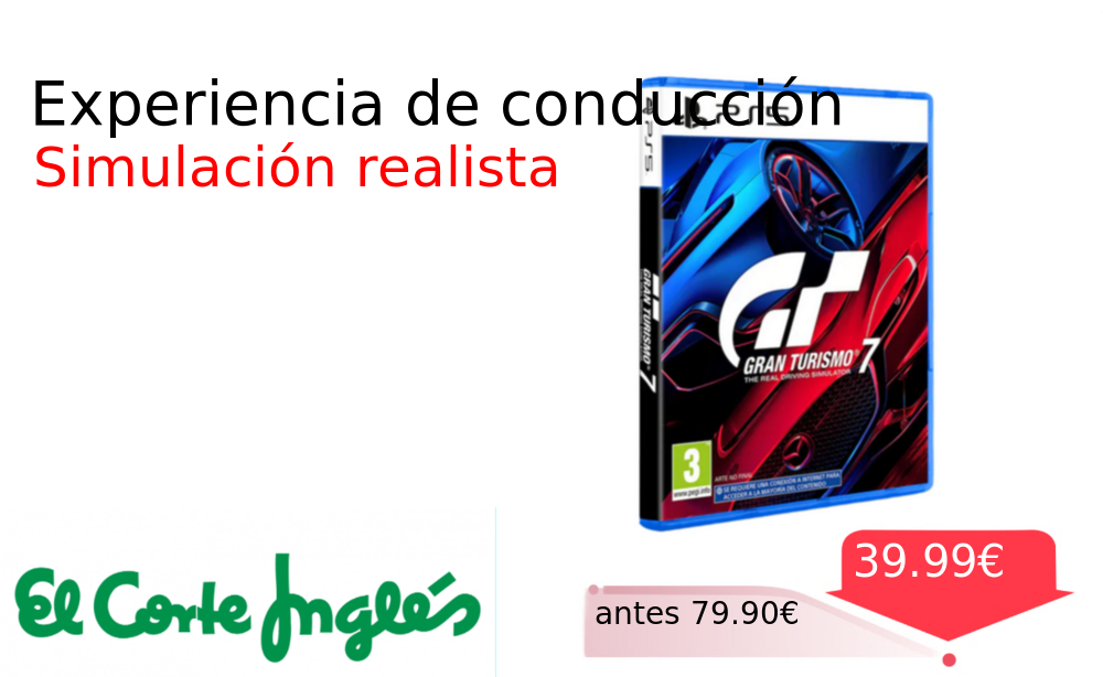 40% 📉 Vaya descuentazo‼‼ Experiencia de conducción❗️🆕 #Elcorteingles 📛Precio Ya 39.99€❗️ (PVP: +79.90€) ✨Vive la experiencia definitiva de conducción con gráficos realistas y una colección de autos legendarios La simulación más completa con diseno innovador y funcional. cholloya.com/GT7_PS5