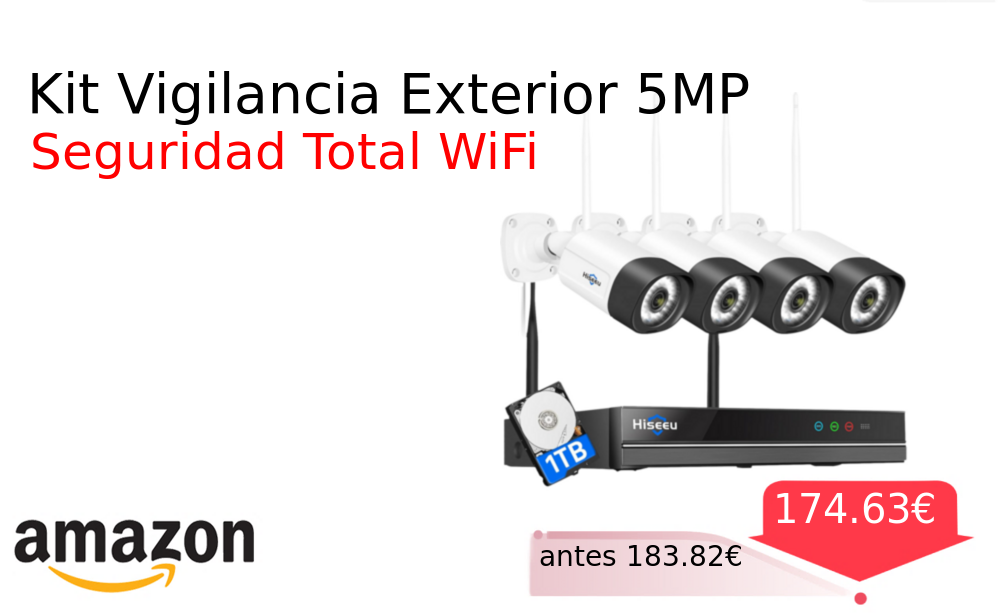 Buen Precio✨ Kit Vigilancia Exterior 5MP❗️🆕 #Amazon 🇪🇸 📛Precio Ya 174.63€❗️ (PVP: +183.82€) ✨Kit de vigilancia exterior con 4 cámaras WiFi 5MP y visión nocturna en color Sistema NVR 10 canales incluye disco duro 1TB Detección inteligente. cholloya.com/HISEEU_KIT_5MP