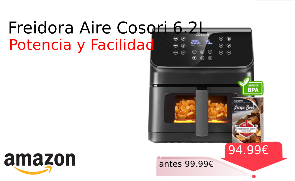 Buen Precio✨ Freidora Aire Cosori 6.2L❗️🆕 #Amazon 🇪🇸 📛Precio Ya 94.99€❗️ (PVP: +99.99€) ✨Freidora de aire con capacidad 6 2 litros y ventana de visualización Tecnología Rapid Air para cocinar con menos grasa Panel táctil LED. cholloya.com/COSORI_AIRFRYER