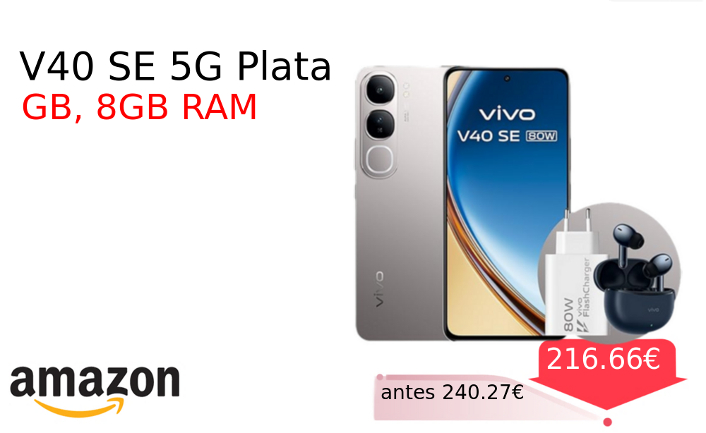 Buen Precio✨ V40 SE 5G Plata❗️🆕 #Amazon 🇪🇸 📛Precio Ya 216.66€❗️ (PVP: +240.27€) ✨Smartphone 5G con pantalla AMOLED de 120Hz y 6 67 pulgadas Cámara principal de 50MP con Aura Light para retratos profesionales Incluye auriculares TWS. cholloya.com/VIVO_V40_SE_5G