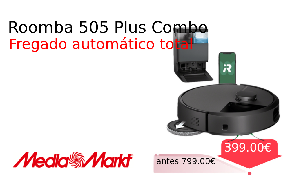 Mitad de precio✂️ Roomba 505 Plus Combo❗️🆕 #MediaMarkt 📛Precio Ya 399.00€❗️ (PVP: +799.00€) ✨Robot friegasuelos con base autolimpiante Mopas DualClean llegan más cerca de los bordes para una limpieza profunda Alta autonomía y depósito de agua generoso. cholloya.com/ROOMBA_505_PLUS