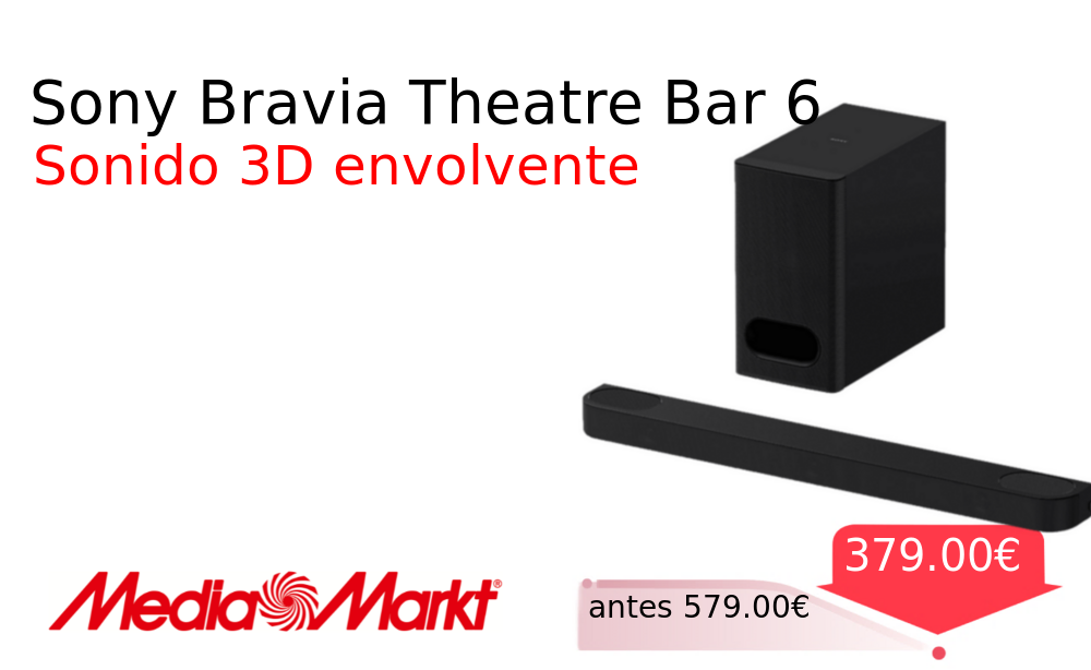 Más de un 30% 🚀 Sony Bravia Theatre Bar 6❗️🆕 #MediaMarkt 📛Precio Ya 379.00€❗️ (PVP: +579.00€) ✨Sistema 3 1 2 con sonido envolvente Dolby Atmos y altavoces ascendentes Subwoofer integrado y tecnología Voice Zoom 3 para diálogos nítidos. cholloya.com/SONY_BRAVIA_BAR