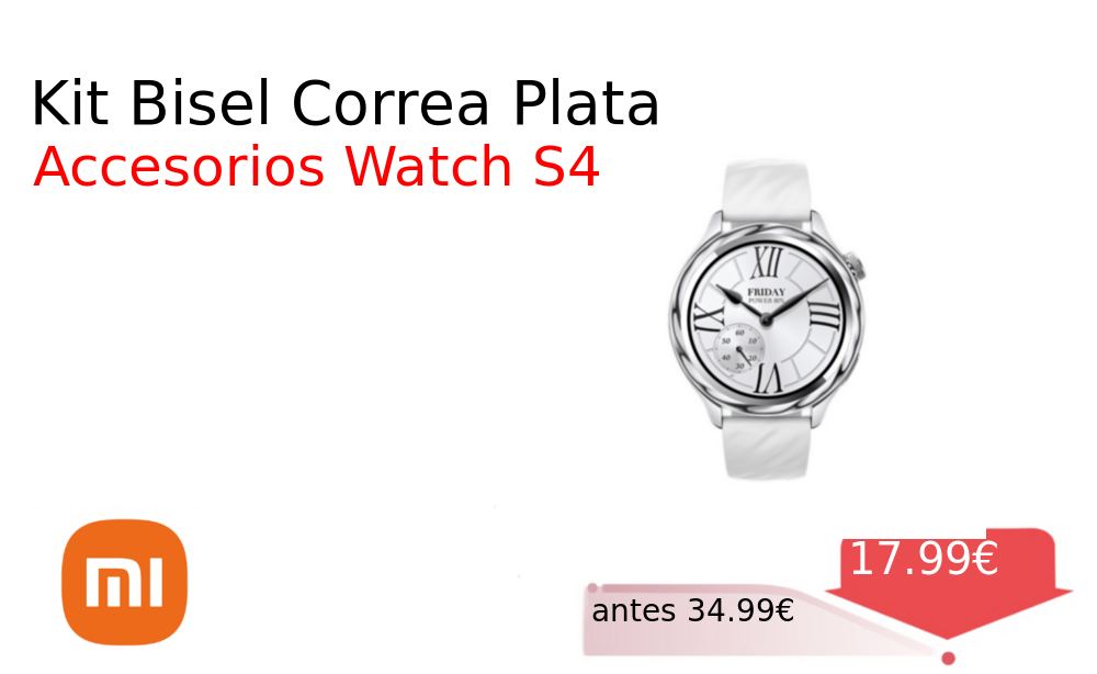 40% 📉 Vaya descuentazo‼‼ Kit Bisel Correa Plata❗️🆕 #Mi 📛Precio Ya 17.99€❗️ (PVP: +34.99€) ✨Kit original Xiaomi con bisel y correa en plata líquida para tu Watch S4 Personaliza tu reloj con accesorios oficiales garantizados diseño premium y. cholloya.com/XIAOMI_WATCH_S4