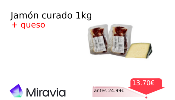 Ahorra en tus compras💸 Jamón curado 1kg❗️🆕 #Miravia 📛Precio Ya 13.47€❗️ (PVP: +24.99€) ✨Disfruta de nuestra gastronomía con estos dos grandes productos en oferta en Miravia. Aplica el cupón del 10% del vendedor para que te salga un poquito más barato cholloya.com/JAMONQUESO