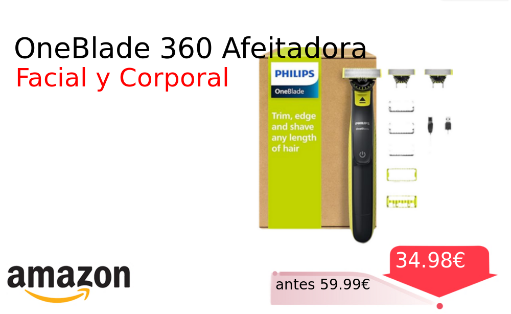 40% 📉 Vaya descuentazo‼‼ OneBlade 360 Afeitadora❗️🆕 #Amazon 🇪🇸 📛Precio Ya 34.98€❗️ (PVP: +59.99€) ✨Afeitadora y recortadora facial y corporal con tres cuchillas giratorias de precisión Incluye peines para barba y un kit corporal específico para un acabado. cholloya.com/PHILIPS_ONEBLAD
