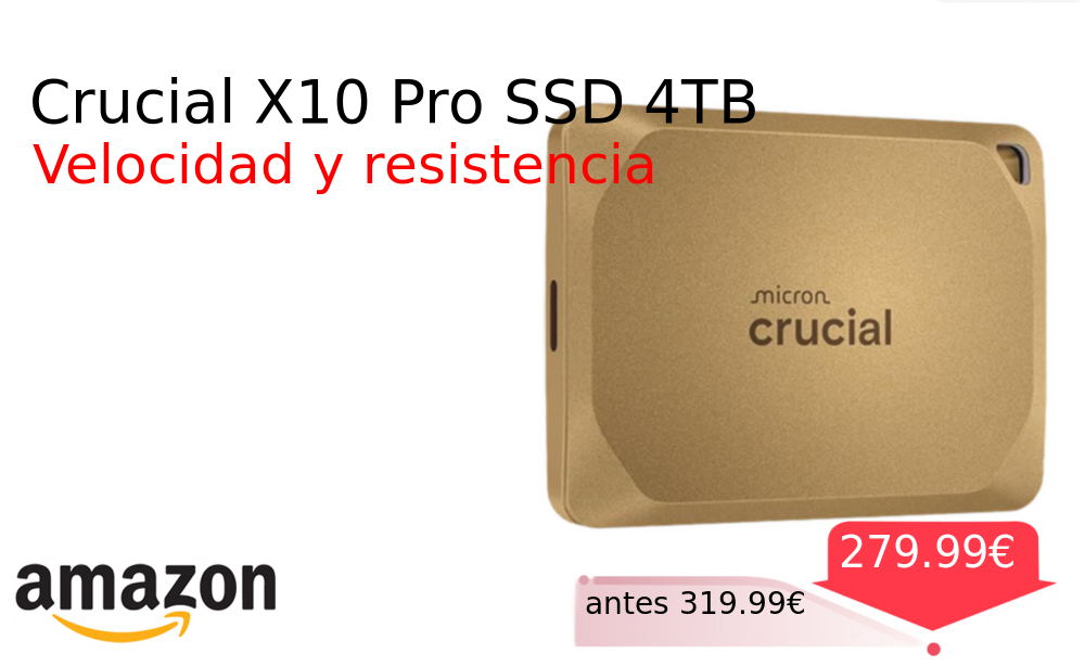 Buen Precio✨ Crucial X10 Pro SSD 4TB❗️🆕 #Amazon 🇪🇸 📛Precio Ya 279.99€❗️ (PVP: +319.99€) ✨Disco duro externo portátil de 4TB con velocidades ultrarrápidas de lectura y escritura Resistente al agua y al polvo compatible con PC y Mac. cholloya.com/CRUCIAL_X10_PRO