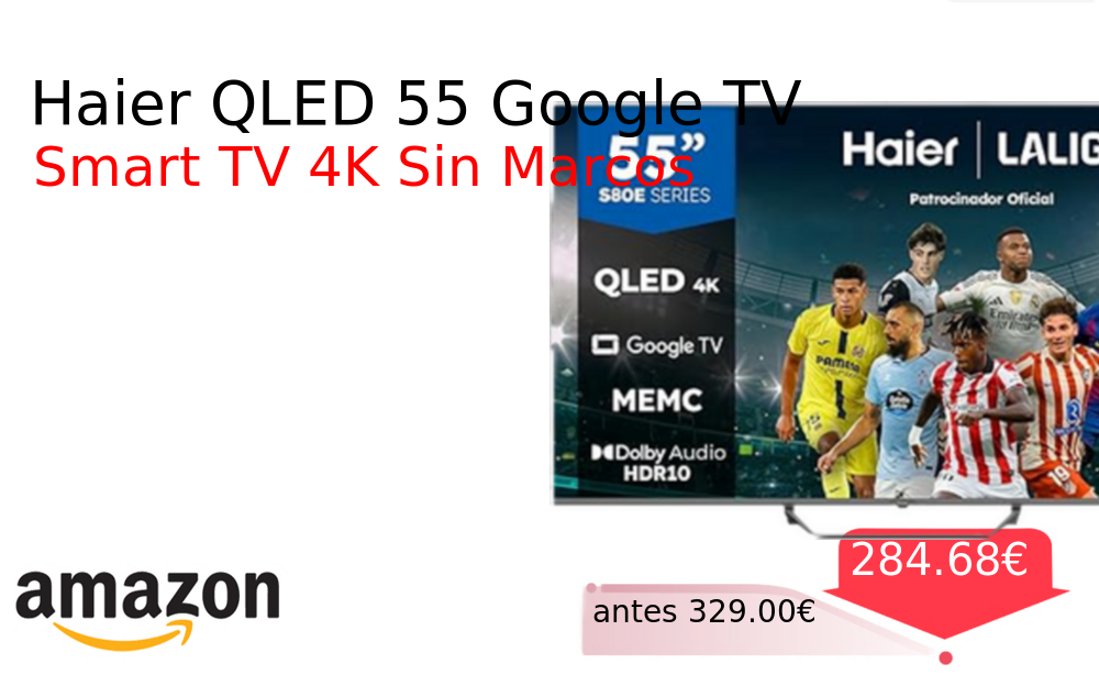 Buen Precio✨ Haier QLED 55 Google TV❗️🆕 #Amazon 🇪🇸 📛Precio Ya 284.68€❗️ (PVP: +329.00€) ✨Televisor inteligente de 55 pulgadas con resolución QLED 4K UHD y sistema Google TV Incluye sonido Dolby Audio tecnología HDR 10 y un diseño. cholloya.com/HAIER_QLED_55_T
