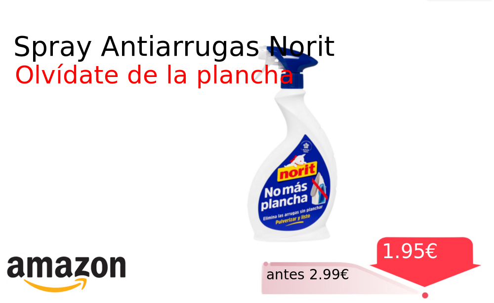 Más de un 30% 🚀 Spray Antiarrugas Norit❗️🆕 #Amazon 🇪🇸 📛Precio Ya 1.95€❗️ (PVP: +2.99€) ✨Spray antiarrugas que elimina las arrugas de la ropa sin necesidad de plancha Aroma fresco apto para todo tipo de tejidos y con una. cholloya.com/NORIT_NO_PLANCH