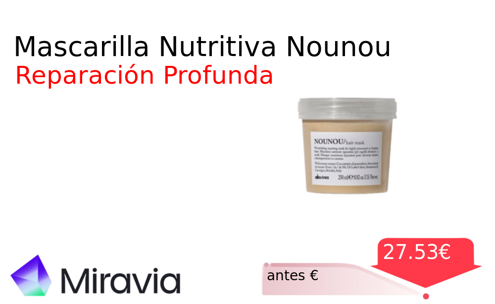 Buen Precio✨ Mascarilla Nutritiva Nounou❗️🆕 #Miravia 📛Precio Ya 27.53€❗️ (PVP: +€) ✨Mascarilla capilar nutritiva que repara intensamente el cabello dañado Restaura suavidad y brillo con ingredientes de calidad profesional con diseno innovador y funcional. cholloya.com/DAVINES_NOUNOU