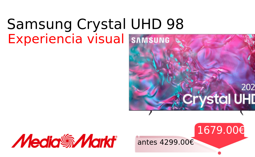 Mitad de precio✂️ Samsung Crystal UHD 98❗️🆕 #MediaMarkt 📛Precio Ya 1679.00€❗️ (PVP: +4299.00€) ✨Pantalla gigante Samsung con tecnología Crystal UHD 4K Procesador inteligente mejora imágenes y colores mediante IA Calidad excepcional con reducción de ruido y nitidez. cholloya.com/TV_SAMSUNG_98
