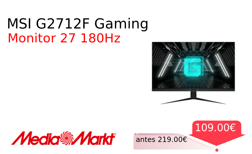 Mitad de precio✂️ MSI G2712F Gaming❗️🆕 #MediaMarkt 📛Precio Ya 109.00€❗️ (PVP: +219.00€) ✨Monitor gaming MSI con panel IPS de 27 pulgadas Resolución Full HD frecuencia 180 Hz y respuesta 1 ms para ventaja competitiva en partidas. cholloya.com/MSI_G2712F_GAMI