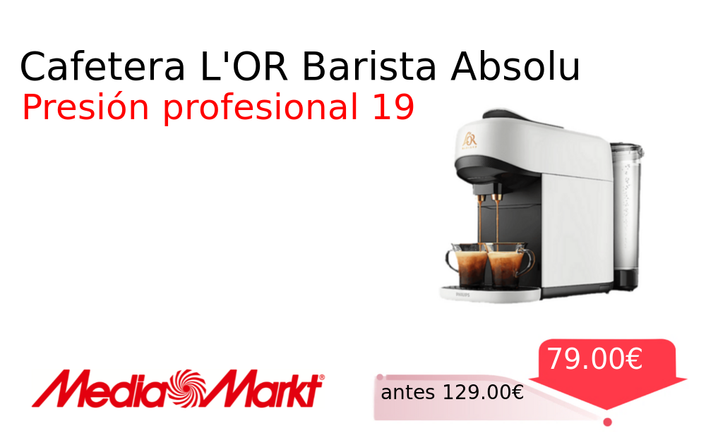 Más de un 30% 🚀 Cafetera L'OR Barista Absolu❗️🆕 #MediaMarkt 📛Precio Ya 79.00€❗️ (PVP: +129.00€) ✨Cafetera de cápsulas Philips con presión profesional de 19 bares Depósito de 1 2 litros y diseño blanco elegante Prepara cafés intensos con espuma. cholloya.com/PHILIPS_LM9512_