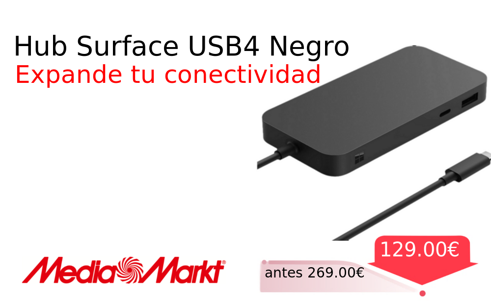 Mitad de precio✂️ Hub Surface USB4 Negro❗️🆕 #MediaMarkt 📛Precio Ya 129.00€❗️ (PVP: +269.00€) ✨Amplía tu Surface con múltiples puertos USB-C y HDMI Conexión rápida para transferir datos y conectar varios dispositivos simultáneamente en tu escritorio. cholloya.com/MICROSOFT_SURFA