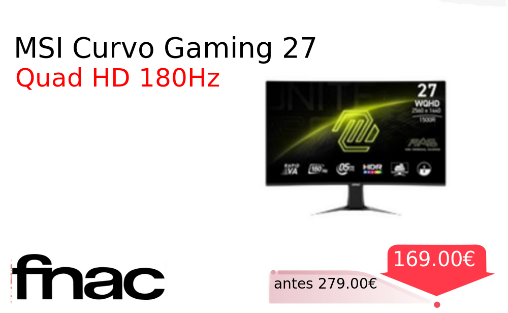 Más de un 30% 🚀 MSI Curvo Gaming 27❗️🆕 #fnac 📛Precio Ya 169.00€❗️ (PVP: +279.00€) ✨Monitor curvo gaming MSI de 27 pulgadas con resolución Quad HD y frecuencia de actualización de 180Hz para una experiencia visual inmersiva y fluida. cholloya.com/MSI_MAG_27CQ6F