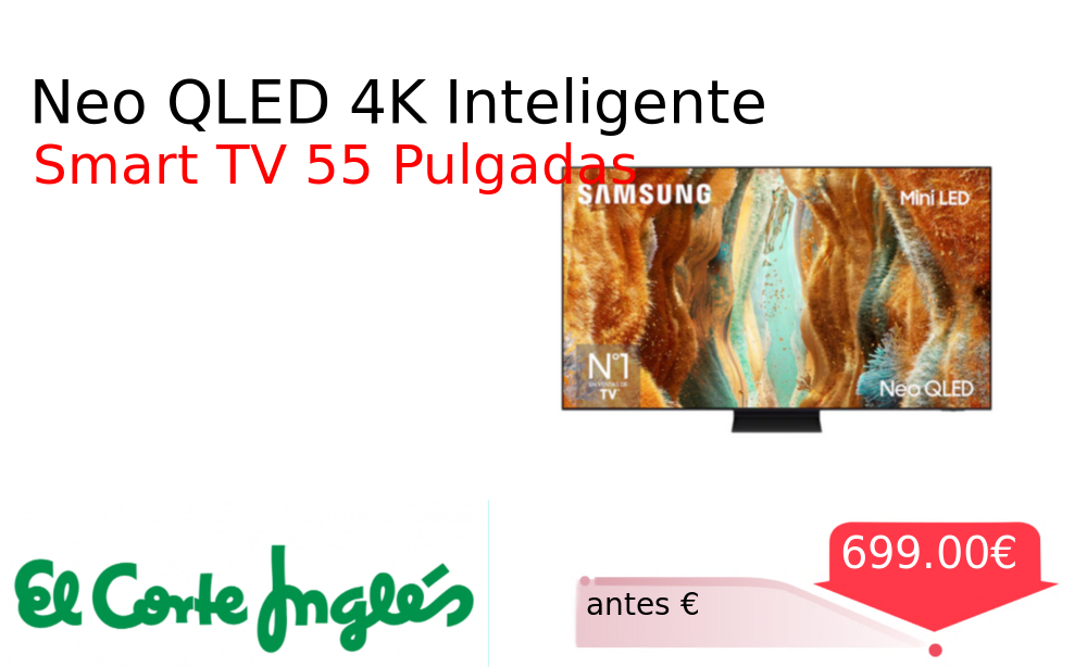 Buen Precio✨ Neo QLED 4K Inteligente❗️🆕 #Elcorteingles 📛Precio Ya 699.00€❗️ (PVP: +€) ✨Televisor con tecnología Neo QLED Mini LED de 139cm Resolución 4K y procesador de IA para optimización automática de contenido Sonido envolvente y diseño. cholloya.com/TV_SAMSUNG_QN74