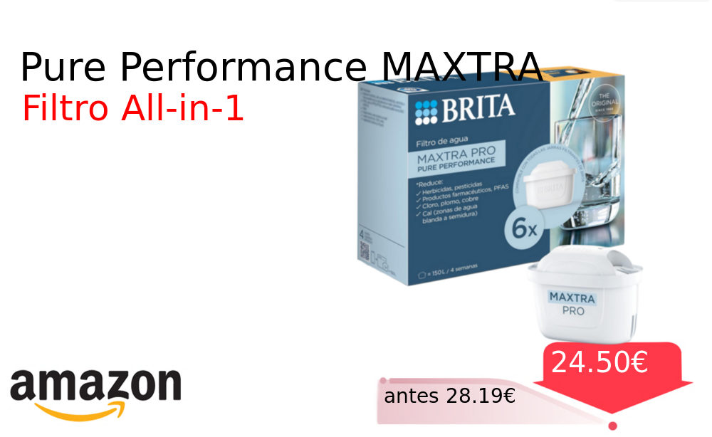 Buen Precio✨ Pure Performance MAXTRA❗️🆕 #Amazon 🇪🇸 📛Precio Ya 24.50€❗️ (PVP: +28.19€) ✨Cartucho filtrante avanzado que elimina PFAS cloro cal y metales Garantiza agua de sabor puro en todas las jarras BRITA con tecnología premium integrada. cholloya.com/BRITA_MAXTRA_PR