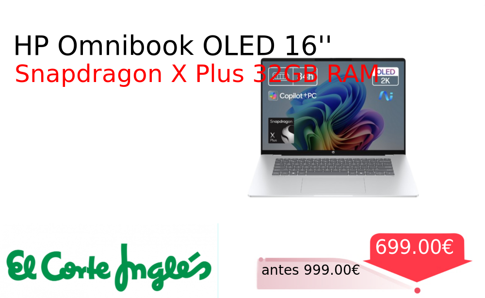 ¡Toma descuento!🤯 HP Omnibook OLED 16''❗️🆕 #Elcorteingles 📛Precio Ya 699.00€❗️ (PVP: +999.00€) ✨Potente y silencioso, este portátil HP con Snapdragon X Plus, 32 GB RAM y pantalla OLED de 16" ofrece rendimiento fluido, diseño premium y Copilot integrado. cholloya.com/OMNIBOOKOLED