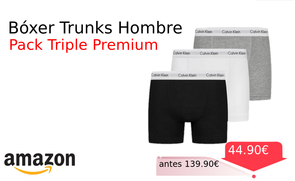 Mitad de precio✂️ Bóxer Trunks Hombre❗️🆕 #Amazon 🇪🇸 📛Precio Ya 44.90€❗️ (PVP: +139.90€) ✨Bóxer trunks de diseño moderno con ajuste perfecto Tejido suave y transpirable para máxima comodidad diaria Pack triple con calidad premium Calvin Klein. cholloya.com/CK_TRUNKS_HOMBR
