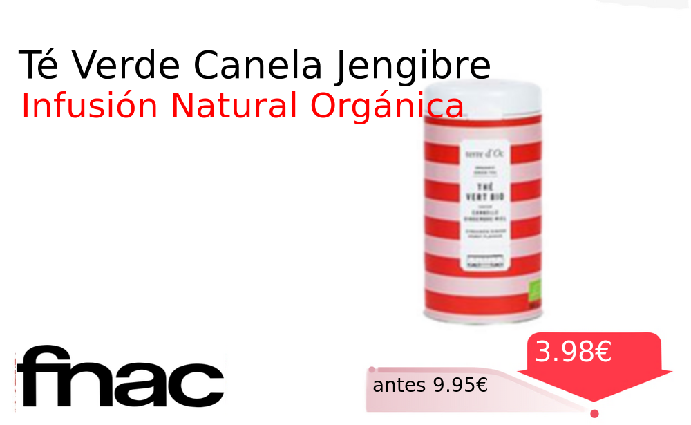 Mitad de precio✂️ Té Verde Canela Jengibre❗️🆕 #fnac 📛Precio Ya 3.98€❗️ (PVP: +9.95€) ✨Té verde orgánico con canela jengibre y miel Infusión natural de 100 gramos ideal para momentos de relax y bienestar diario. cholloya.com/TE_VERDE_ORGANI