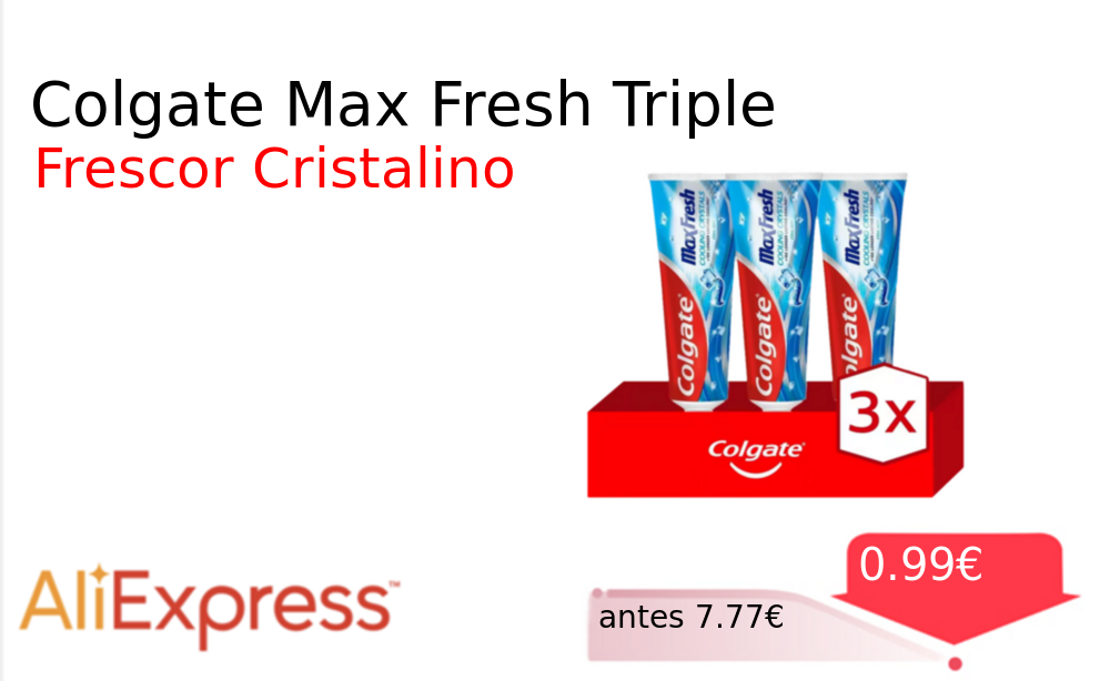 Mitad de precio✂️ Colgate Max Fresh Triple❗️🆕 #AliExpress 📛Precio Ya 0.99€❗️ (PVP: +7.77€) ✨Pasta dental con cristales refrescantes que proporciona un aliento fresco duradero Formato menta intensa en práctico pack triple para tu higiene bucal diaria. cholloya.com/COLGATE_MAX_FRE