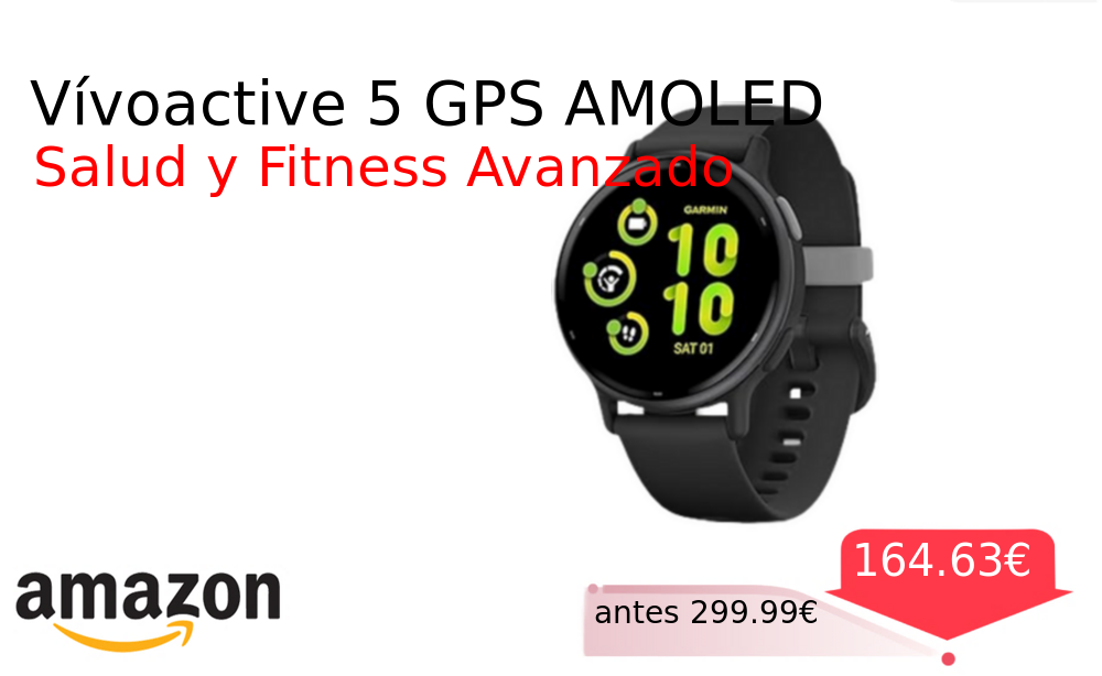 40% 📉 Vaya descuentazo‼‼ Vívoactive 5 GPS AMOLED❗️🆕 #Amazon 🇪🇸 📛Precio Ya 164.63€❗️ (PVP: +299.99€) ✨Smartwatch con GPS integrado y pantalla AMOLED brillante Monitoriza tu salud y actividad física con precisión Disfruta de una autonomía prolongada para tu día. cholloya.com/VIVOACTIVE_5_GP