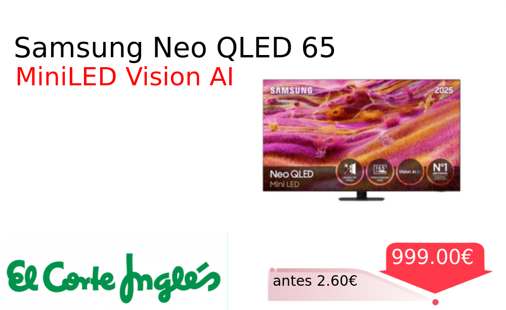 Ofertón del Black Friday🖤 Samsung Neo QLED 65❗️🆕 #Elcorteingles 📛Precio Ya 999.00€❗️ (PVP: +2.60€) ✨Televisor Samsung con tecnología Neo QLED MiniLED de 163 cm. Resolución 4K Ultra HD procesador Vision AI para imágenes nítidas y colores vibrantes Smart. cholloya.com/TV_SAMSUNG_QN90