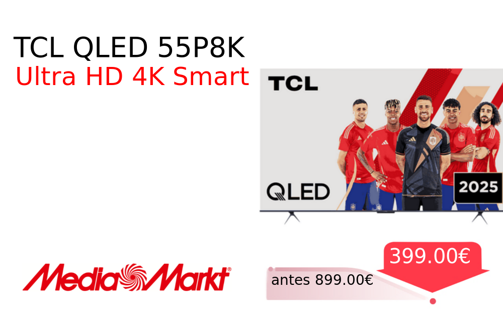 Mitad de precio✂️ TCL QLED 55P8K❗️🆕 #MediaMarkt 📛Precio Ya 399.00€❗️ (PVP: +899.00€) ✨Televisor QLED 55 pulgadas con resolución UHD 4K y tecnología AiPQ Pro Sonido inmersivo y colores vivos gracias a cristales cuánticos Smart TV. cholloya.com/TCL_55P8K_TV